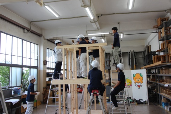 また、マイスターコースの生徒7名は模擬の棟上げ作業を体験しました。普段の実習では経験できない棟上げ作業を、図面と実際の部材を確認しながら順序通りに組み上げることで、建築現場の技術を実感することができました。