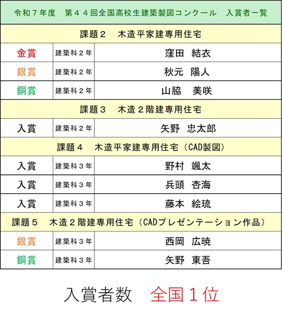 今回は、全国高校生建築製図コンクールに参加し、金賞1名を含む9名が入賞となりました。