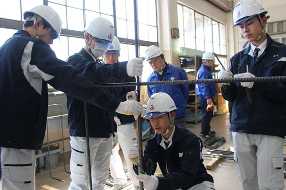 鉄筋工事の知識や鉄筋の製作工程の動画を見学し、各班に分かれ独立基礎の鉄筋組み立てや鉄筋継手のガス圧接の体験を行いました。